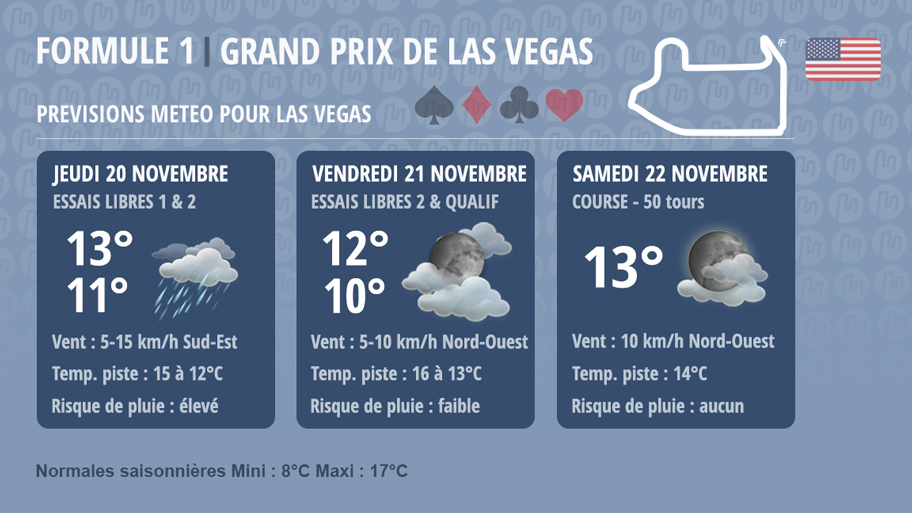 La Formule 1 retrouve le Strip pour la 22ᵉ manche du championnat, et cette fois, le spectacle ne viendra pas seulement des monoplaces. La météo s’annonce comme l’un des acteurs majeurs du week-end : averses possibles dès jeudi soir, températures nettement en dessous des normales pour les qualifications et la course… autant d’éléments qui pourraient bouleverser les plans des équipes et redistribuer les cartes. Voici votre bulletin météo complet pour un rendez-vous où chaque détail pourrait faire la différence.