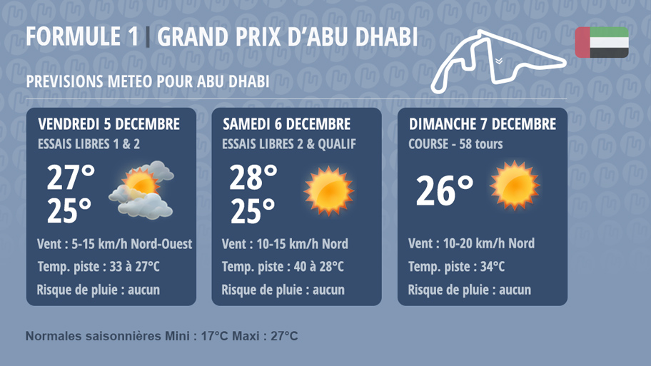 Sans surprise en cette période de l’année, le temps à Abu Dhabi demeure largement ensoleillé, avec des précipitations restent extrêmement rares. Bien que des vents pouvant atteindre 50 km/h puissent soulever des tempêtes de poussière, le port de Yas Marina bénéficie d’une protection naturelle et artificielle grâce à de nombreuses barrières, limitant ainsi considérablement l’impact du sable sur le circuit. En décembre, les températures moyennes oscillent généralement entre 17°C et 27°C.